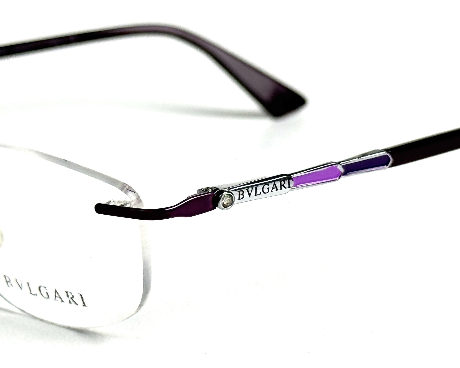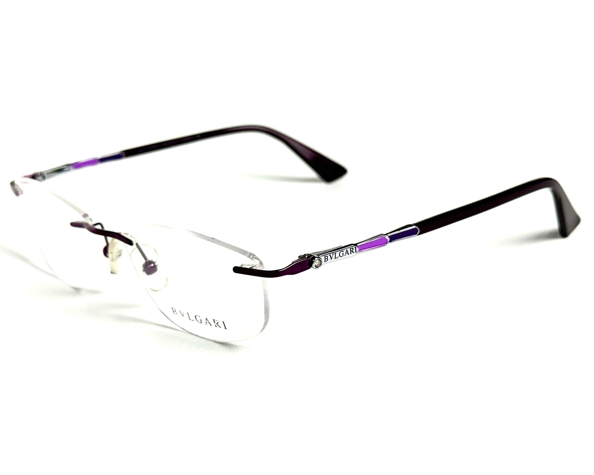 The BVLGARI 1010 Rimless features purple accents around the frame. The rimless design features a subtle vintage design, open to endless customizations.