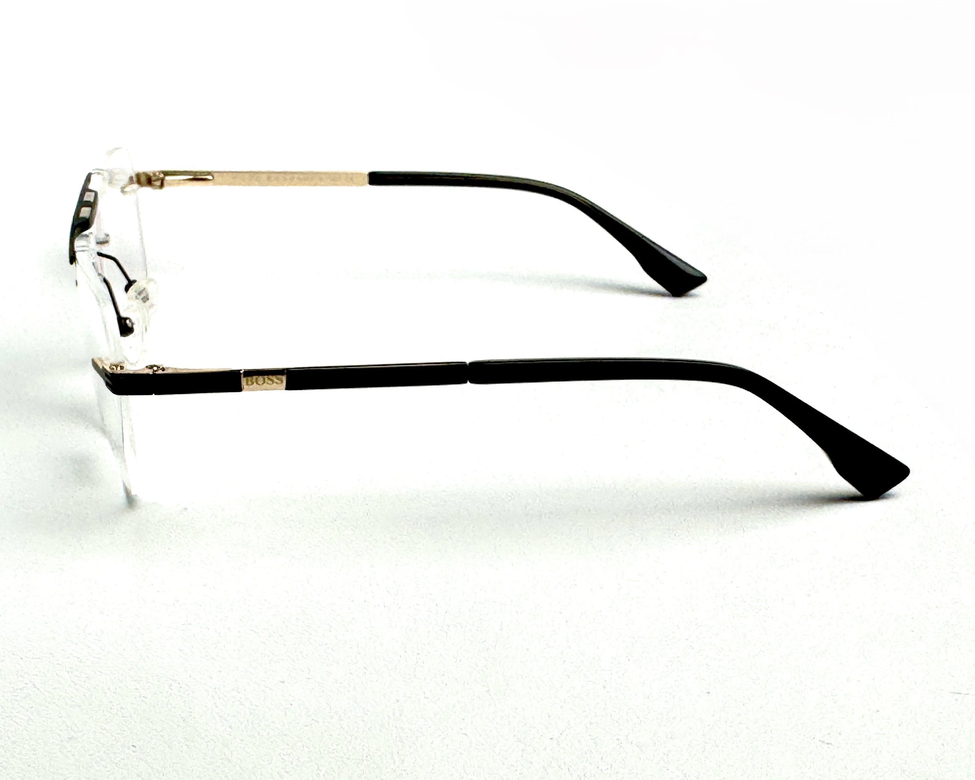 HUGO BOSS G5013 Black Rimless features a squared rimless design. It showcases a black front along with golden accents on it's temples. The double bridge of this design gives it a hint of uniqueness along with the rimless design opening the doors to limitless customization.